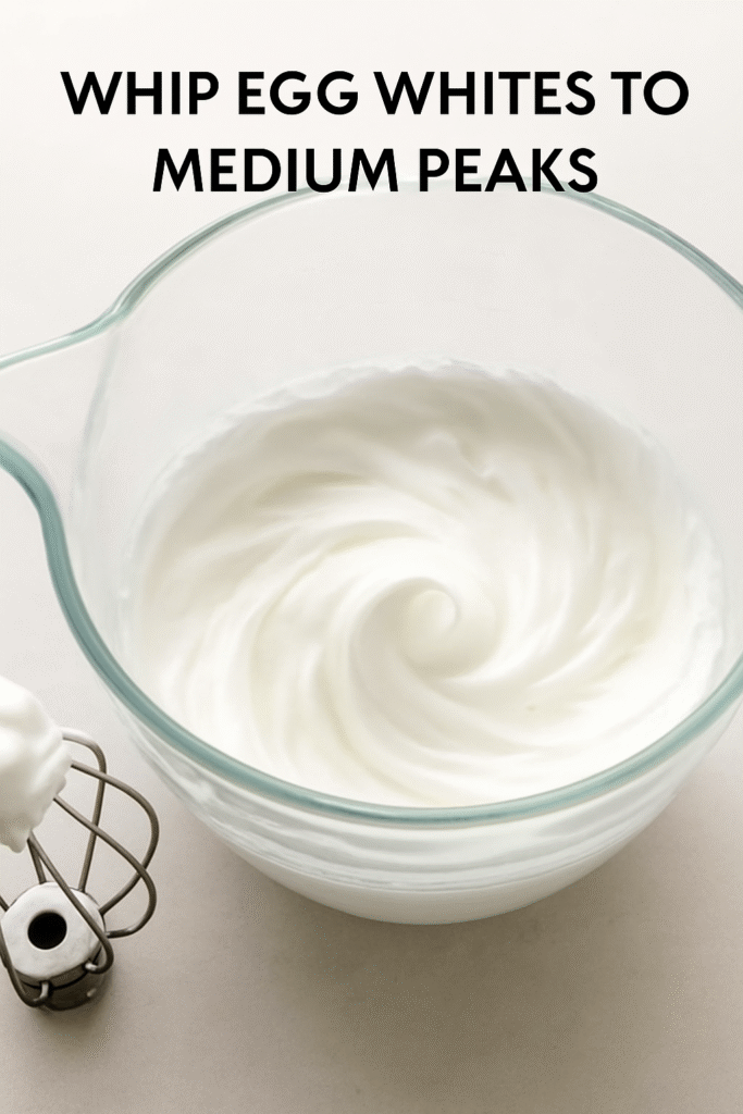 Beat the egg whites with part of the sugar until they form soft-to-medium peaks. Expect this to require around four to five minutes—possibly longer in damp or humid weather. If it seems slow, just stay patient and continue whisking until the texture is right.