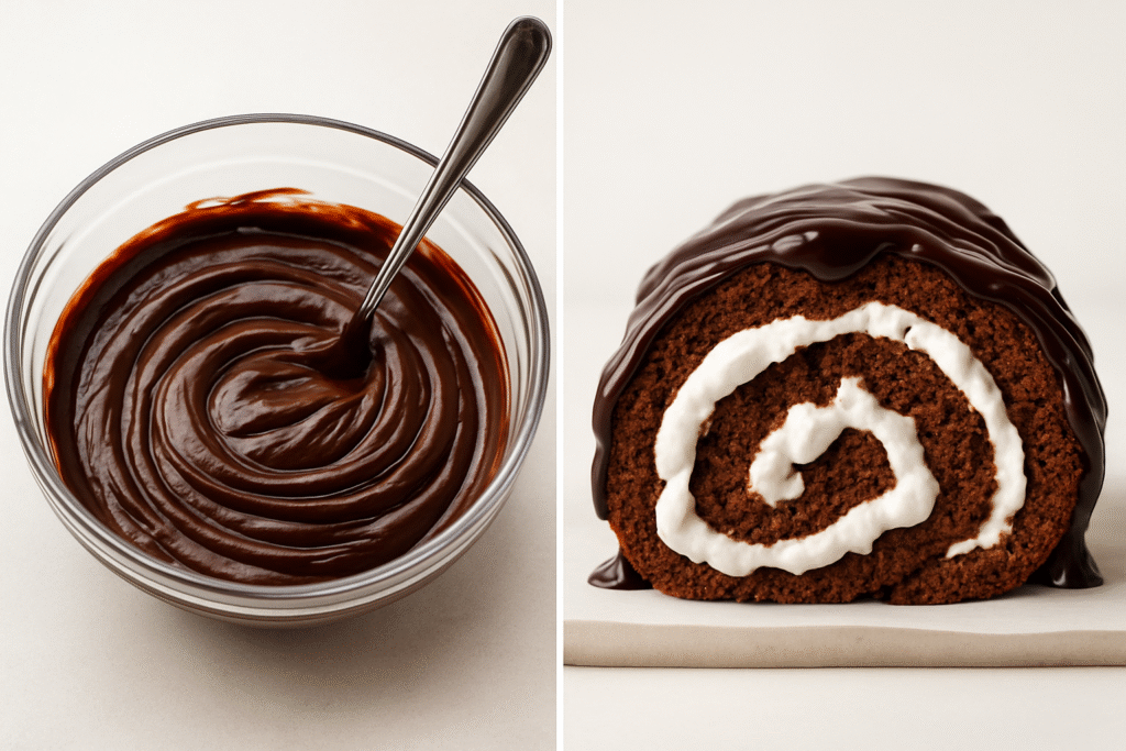 Final assembly: Once fully cooled, unroll, spread whipped cream filling across the surface, roll again (discarding the paper or towel), and finish by covering with a smooth layer of ganache.