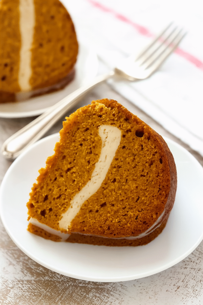 Grease a 10-inch Bundt pan and spoon in half of the pumpkin batter. Spread the cream cheese filling evenly on top, then cover with the remaining batter. Bake in a preheated oven for about one hour to seventy minutes, or until a tester comes out clean.